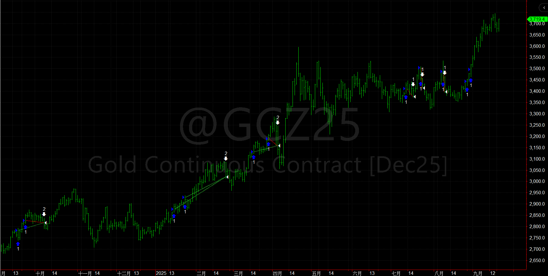 上圖中的這一年,漲幅約有4成,但在今年4月被洗出場後,整段的上漲行情看似就沒有什麼參與到了,後來大盤整被停損3次,更是對後續的多單不看好了。結果,系統抱到了今年最有價值的部位。
